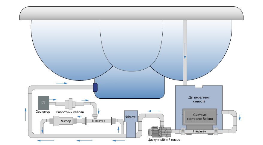 Переливна система надає СПА унікального та стильного вигляду, створюючи ефект дзеркальної гладі.