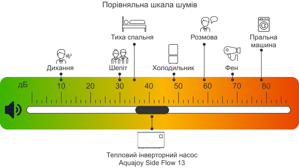 Теплові насоси Aquajoy Side Flow працюють тихо навіть за максимального навантаження завдяки безступінчастому інверторному компресору Mitsubishi. Така система забезпечує плавне регулювання тепловіддачі та стабільну підтримку заданої температури води без різких коливань.