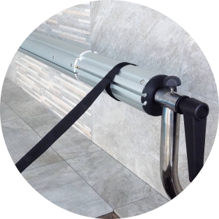 Пристрій надійно фіксується біля борту басейну за допомогою закладних деталей. Механічне управління з ергономічною ручкою забезпечує плавний та рівномірний рух теплозберігаючого покриття.
