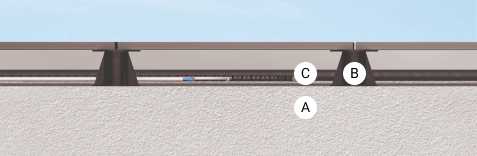 2. Встановити опори (B). Для монтажу використовується набір фіксованих або регульованих пластикових опор. Їх встановлюють безпосередньо на поверхню основи і розміщують в центрі кожної плитки, а також в місцях стиків кутів чотирьох сусідніх плиток. Підставки під фальшпідлогу не вимагають обов'язкової фіксації. Але для зміцнення конструкції можна закріпити основу підставки до перекриття за допомогою цементного розчину або дюбелів. На цей випадок передбачені відповідні отвори в основі підставки. У місцях примикання покриття до стін опори підрізають.