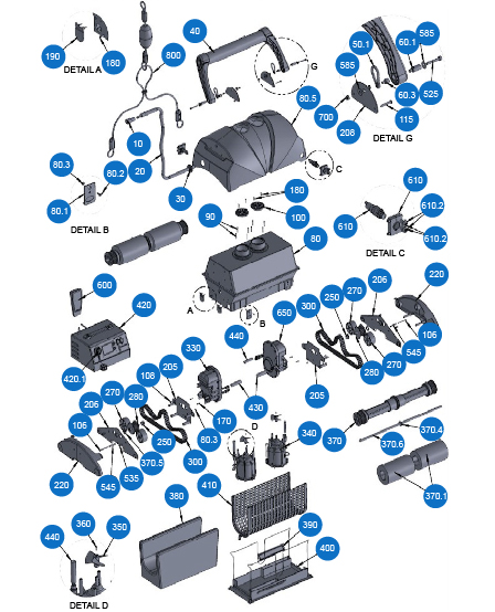 За всмоктування сміття відповідає подвійний насос, а за переміщення – 2 двигуни руху. Блок живлення має індикатор повного фільтра. Пилосос працює від електричної мережі і забезпечений поплавковим кабелем, що не скручується, довжиною 36 метрів. Пилосос поставляється в комплекті з візком для транспортування.