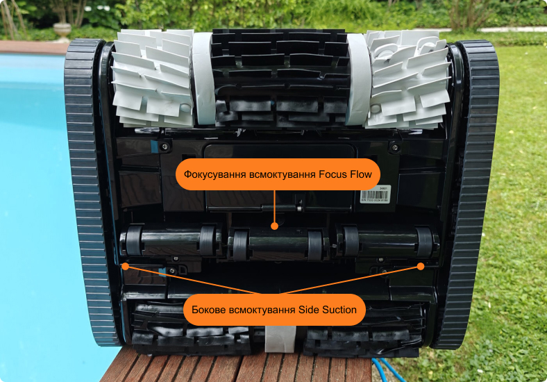 Технологія Side Suction збільшує ширину всмоктування сміття з кожним проходом робота. Завдяки бічним всмоктувальним отворам пилосос відразу ж втягує забруднення. Вода залишається чистою та прозорою.