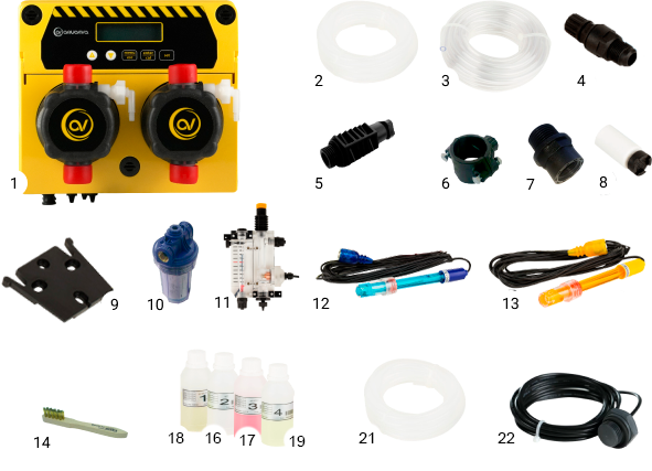 Через застосунок або цифровий LCD-дисплей ви можете легко регулювати продуктивність від 0.5 до 5 л/год або увімкнути режим автоматичної пропорційної дозації згідно із сигналом датчика рН та ячейки для аналізу концентрації вільного хлору. У комплекті із системою насосів постачається датчик рН з набором калібрувальних розчинів та ячейка для аналізу рівня концентрації вільного хлору, щоб ви могли почати використовувати систему одразу після встановлення.
