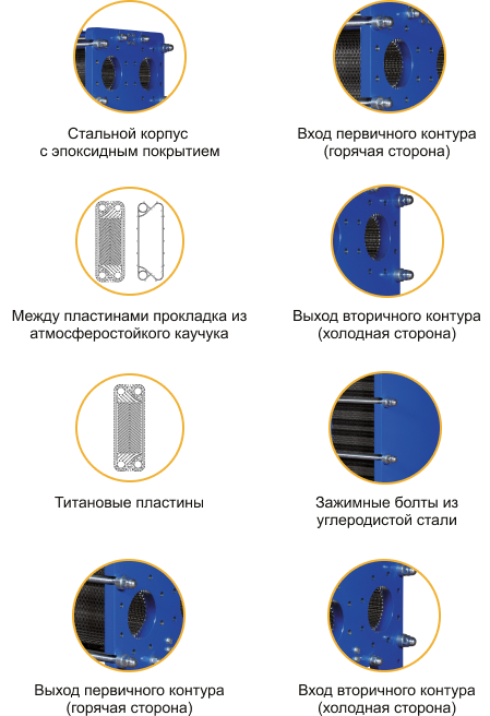 Сталевий корпус с епоксидним покриттям, титанові пластини та прокладки з атмосферостійкого каучука забезпечують довгу та безперебійну роботу обладнання. Також дають можливість поєднувати нагрівач з усіма типами рідин. Ефективний в солоній та хлорованій воді.