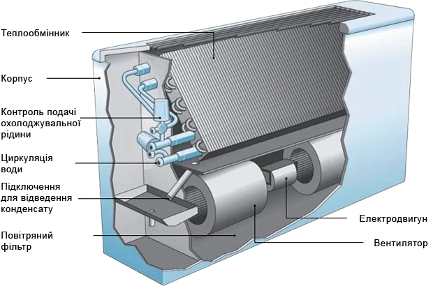 *Фанкойл – вентилятор-доводчик, який завершує елемент системи кондиціонування повітря типу чілер-фанкойл або системи опалювання. Він призначений для рециркуляції та охолодження повітря в приміщенні, яке потребує кондиціонування.