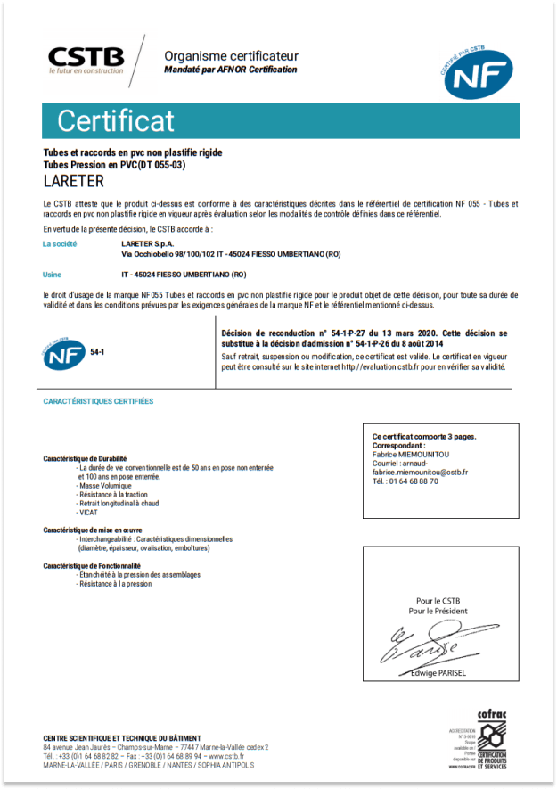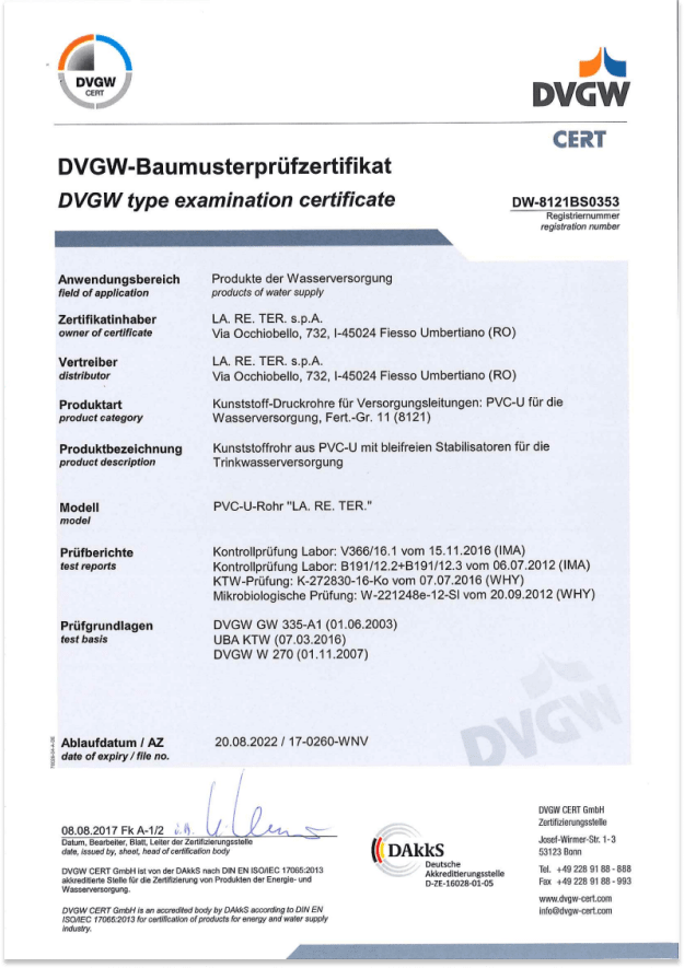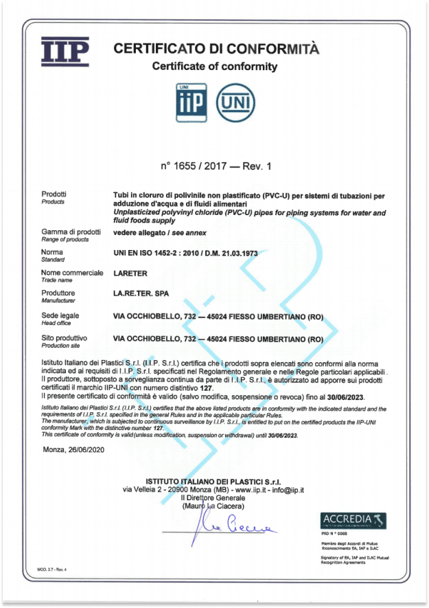 Компанія Lareter з 1961 року випускає нетоксичні напірні труби з ПВХ для транспортування рідини. Lareter стала першою в галузі італійською компанією, яка впровадила на виробництві систему управління якістю, навколишнім середовищем та безпекою, що підтверджується сертифікатами UNI EN ISO 9001, UNI EN ISO 14001 та ISO 45001.